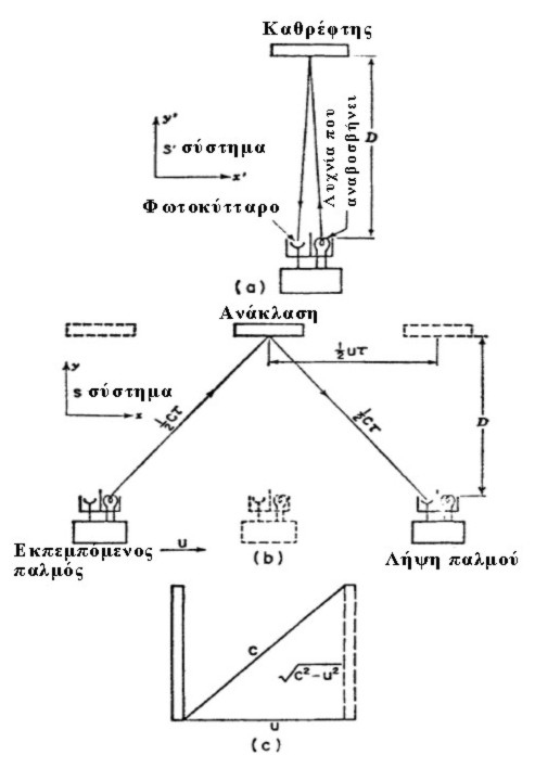 Σχετικότητα 3 Γιάννης Γαϊσίδης 5 Ιουνίου 2016 Comments Εικ. 3. (α) "Ρολόι φωτός" σε ηρεμία στο σύτημα S΄. (b) Το ίδιο ρολόι κινούμενο ως προς το σύστημα S. (c) Διάγραμμα του διαγώνιου δρόμου που παίρνει η δέσμη φωτός του κινούμενου "ρολογιού φωτός". Visited 24 times, 1 visit(s) todayΜοιράσου το... Κλικ για εκτύπωση(Ανοίγει σε νέο παράθυρο) Εκτύπωση Πατήστε για κοινοποίηση στο Facebook(Ανοίγει σε νέο παράθυρο) Facebook Click to share on X(Ανοίγει σε νέο παράθυρο) X Κλικ για κοινοποίηση στο LinkedIn(Ανοίγει σε νέο παράθυρο) LinkedIn Μου αρέσει αυτό:Like Φόρτωση... ← Previous Image Next Image →